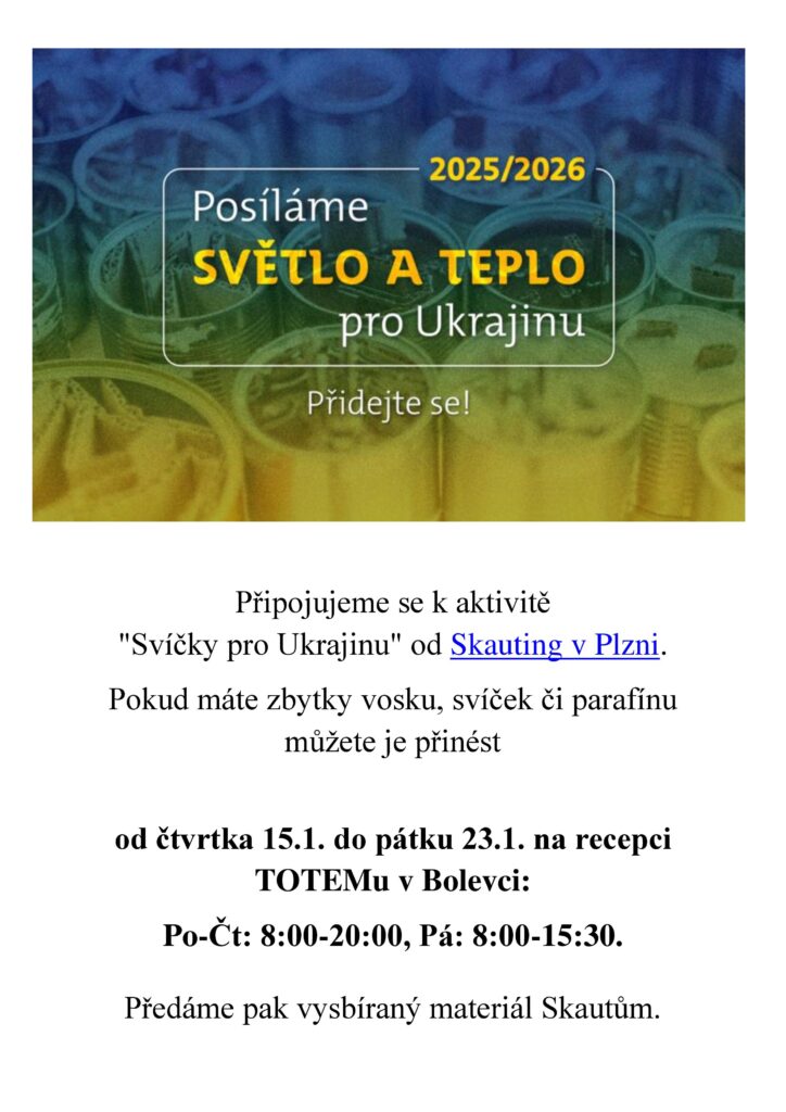 Regionální dobrovolnické centrum Plzeňského kraje se připojuje k iniciativě „Svíčky pro Ukrajinu“, kterou v Plzni organizují skauti. Společně chceme proměnit drobnosti z našich domovů – zbytky svíček, vosku či parafínu – v konkrétní pomoc lidem na Ukrajině.