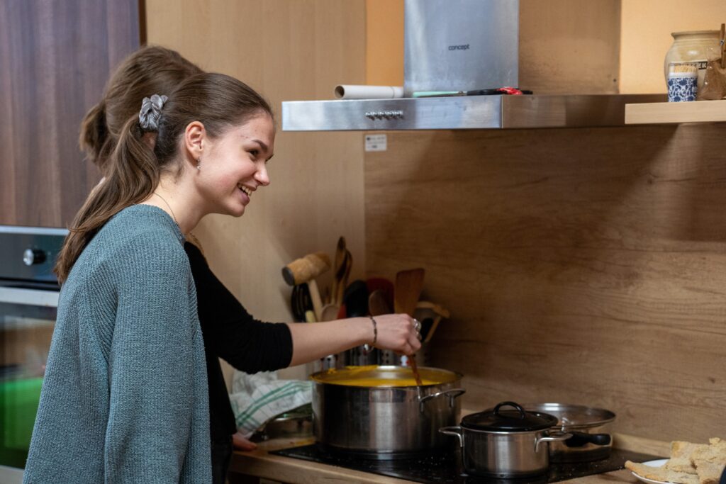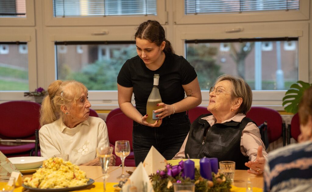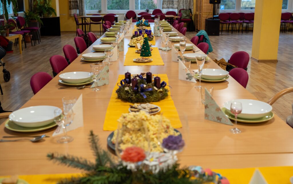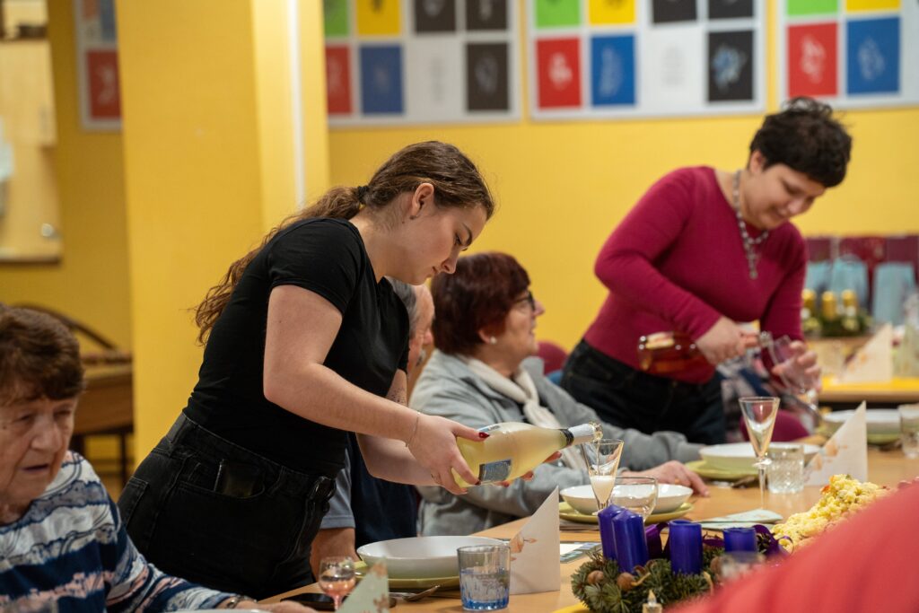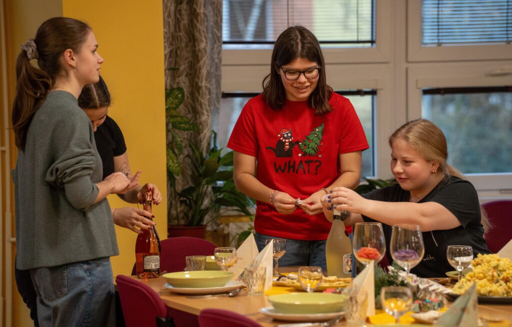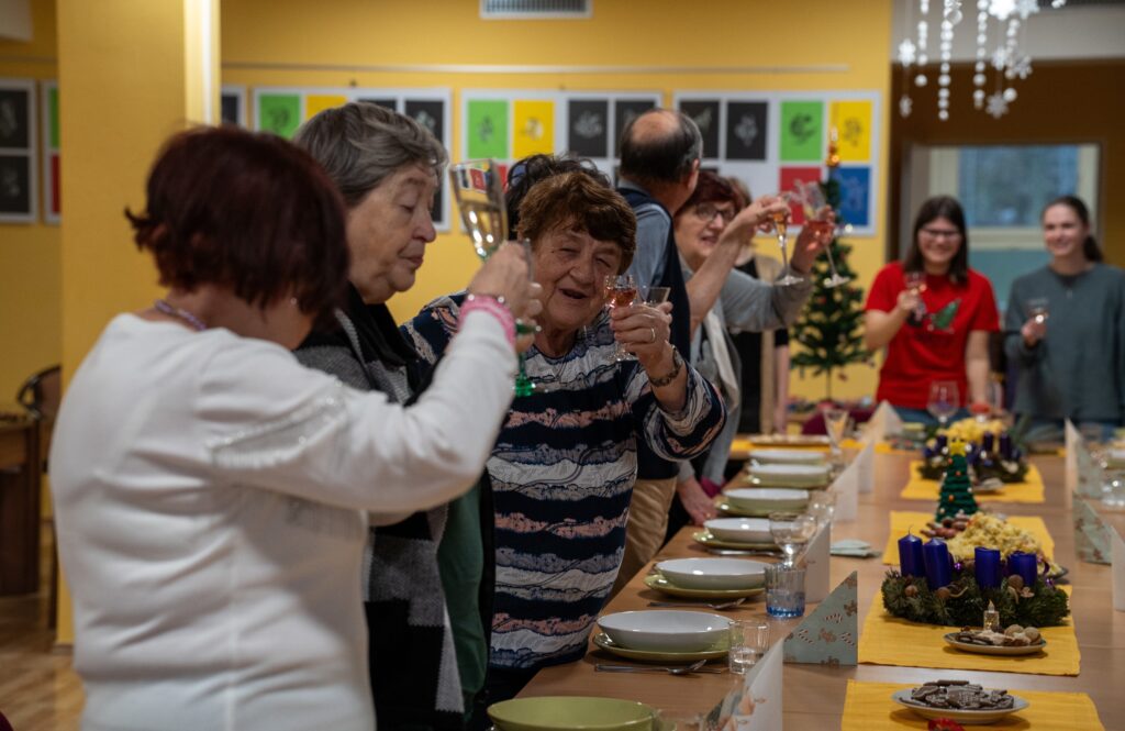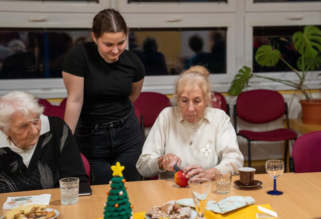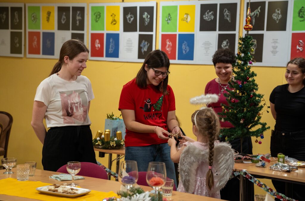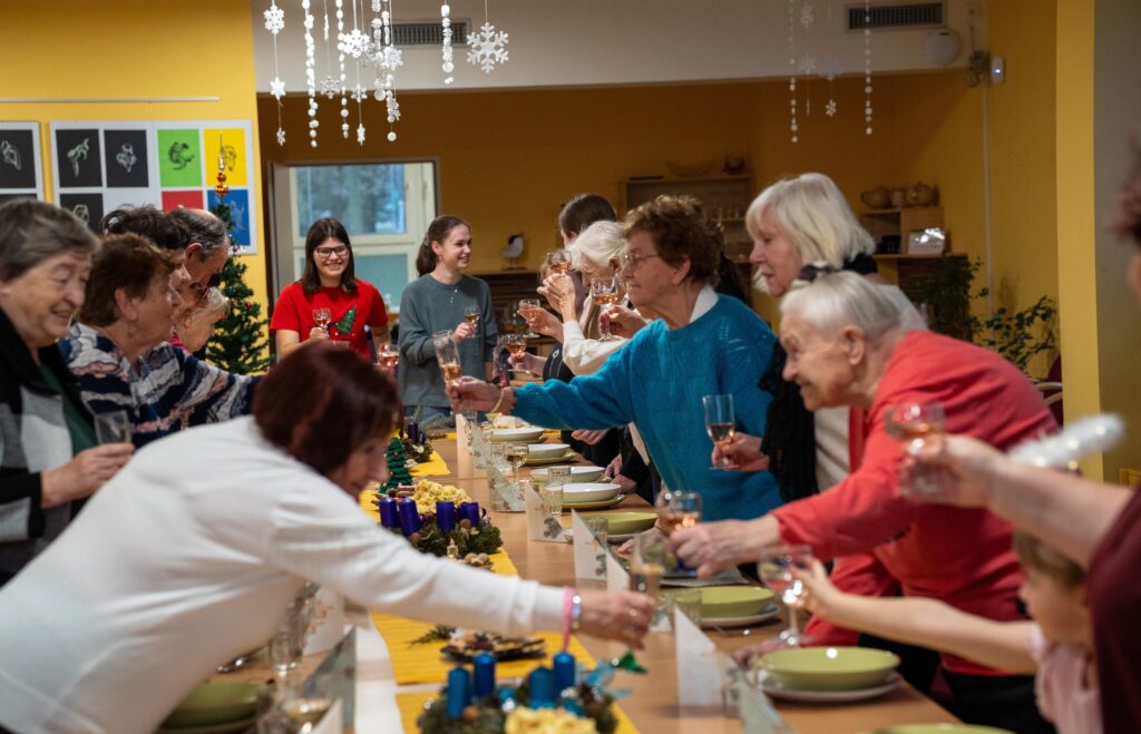 Důležité je říct, že celý den měl svůj přirozený a plynulý rytmus právě díky energii a nasazení studentek. Už od 9:00 ráno se v TOTEMu scházely, připravovaly potraviny, materiál a ladily poslední detaily. Ve 12:00 dorazili senioři, kteří se s chutí zapojili do příprav – společně se vařilo, zdobil se vánoční stromeček i slavnostní tabule. Následovala společná štědrovečerní „večeře“ a rozdávání dárků, po 16. hodině pak koncert, povídání a vánoční tradice. Studentky zůstaly až do konce, postaraly se o úklid a tečku za celým dnem udělaly kolem 19. hodiny. Byla to pro ně skutečná zkušenost odpovědnosti, spolupráce a práce s lidmi v reálném prostředí – a právě jejich klid, nasazení a radostná energie držely celý den pohromadě.