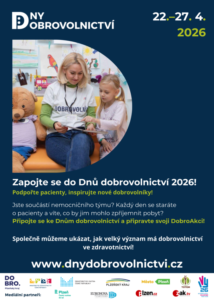 Nemocniční prostředí bývá pro pacienty náročné – nejen fyzicky, ale i psychicky. Pojďme společně zpříjemnit pobyt pacientům v nemocnicích! Dobrovolníci a zdravotníci mohou společně udělat mnoho pro to, aby se hospitalizovaní cítili lépe. Stačí jen trocha času, dobré vůle a chuť zapojit se do Dnů dobrovolnictví 2026!