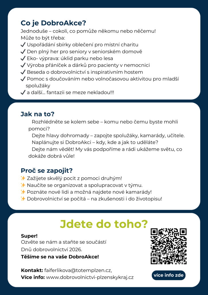 Na základě tohoto setkání vnímáme žákovské parlamenty jako silné a přirozené partnery pro další rozvoj dobrovolnictví v regionu. I proto jsme je již nyní oslovili s nabídkou zapojení do Dnů dobrovolnictví 2026. Aktivní žáci a jejich pedagogové mohou do této platformy přinést nové pohledy, energii a témata, která dobrovolnictví přibližují mladé generaci.